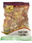 Indyjska przekąska Far Far Kings to tradycyjna indyjska przekąska w formie surowych chrupek, które po usmażeniu w oleju zamieniają się w lekkie, puszyste i chrupiące smakołyki o różnych kształtach – spirale, rurki, kółka i kwiatki. Popularna w całych Indiach zarówno wśród dzieci, jak i dorosłych, często serwowana podczas festiwali, rodzinnych uroczystości lub jako szybka przekąska do herbaty. Dzięki neutralnemu smakowi Far Far można łatwo doprawiać według własnych upodobań – solą, przyprawą masala lub chili. Produkt nie zawiera konserwantów i nadaje się do szybkiego przygotowania zarówno w oleju, jak i na sucho.