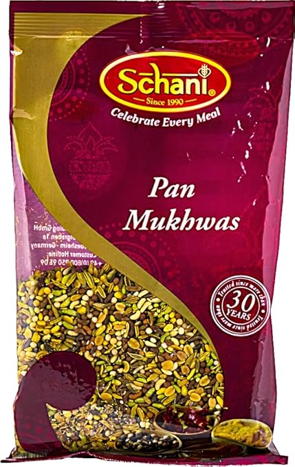Schani Pan Mukhwas to aromatyczna mieszanka nasion i ziół, która nie tylko odświeża oddech, ale również wspiera trawienie po posiłku. Dzięki zawartości mentolu, cukru, liści curry i kwiatów róży, ta kolorowa mieszanka jest tradycyjną formą ajurwedyjskiego odświeżacza ust. Pan Mukhwas to nie tylko smak – to rytuał po każdym posiłku w kuchni indyjskiej.
