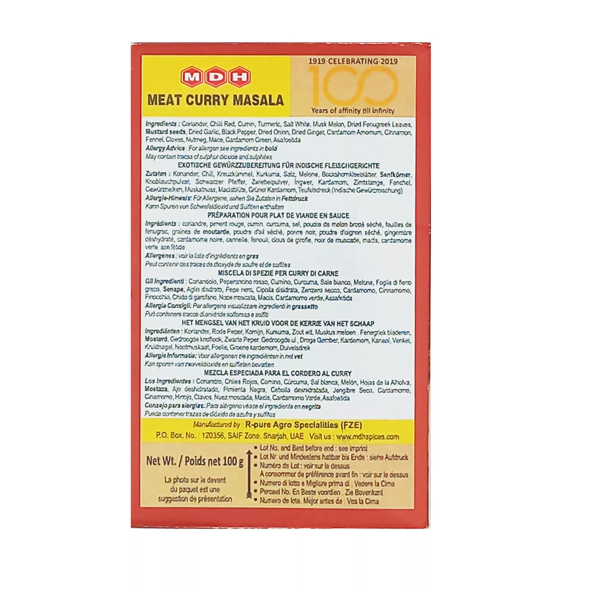 Kolendra, kmin, chili, kurkuma, czarny pieprz, goździki, liście kozieradki, sól, gałka muszkatołowa, suszony imbir, nasiona kardamonu, cynamon, liście laurowe, groszek, koperek, kminek, musztarda, płatki czosnku, płatki cebuli, gałka muszkatołowa, zielony kardamon, asafetyda.